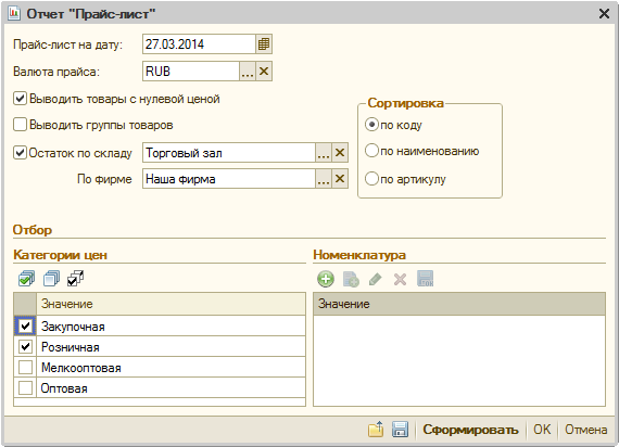 Можно сформировать прайс-лист только по определенным группам номенклатуры или отдельным элементам номенклатуры.