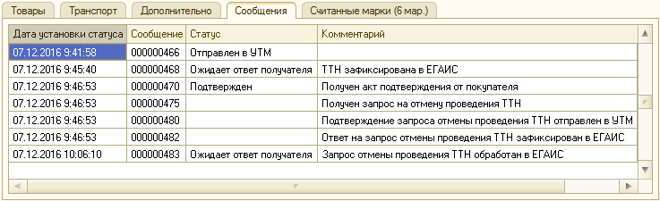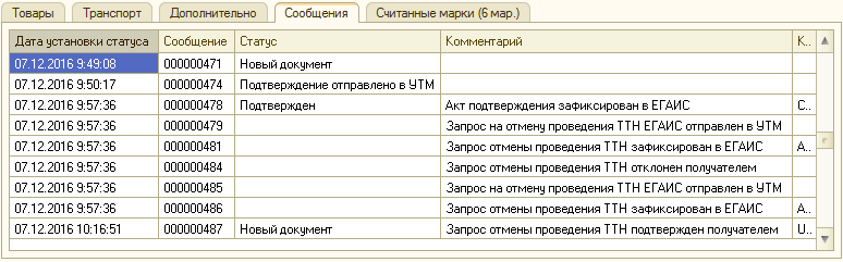 На закладке «Сообщения» доступны все изменения статуса запроса на отмену проведения ТТН в ЕГАИС.