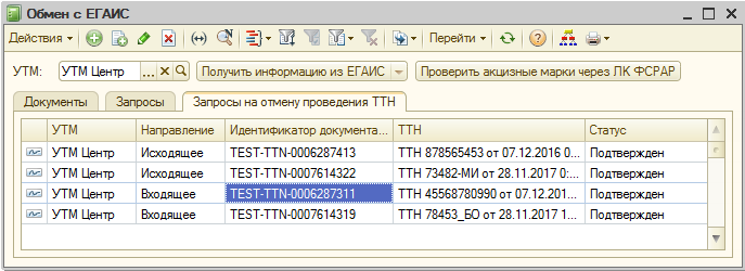 Также все исходящие запросы видны на закладке «Запросы на отмену проведения» в обработке «Обмен с ЕГАИС».