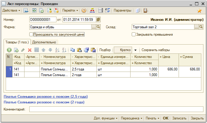 При формировании документа «Акт пересортицы» необходимо помнить о том, что с точки зрения бухгалтерии приходуемый товар на склад учитывается по ставке НДС 0% (ставка НДС будет наследоваться, только если пересорт в рамках характеристик одного товара).
