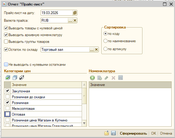 При необходимости включить в прайс-лист товары с нулевой ценой, отобразить архивную номенклатуру, исключить товары с нулевыми остатками и/или вывести названия групп номенклатуры — нужно выставить соответствующие флажки.