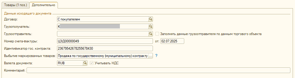 - Продажа товаров по государственному (муниципальному) контракту – этом случае идентификатор гос. контракта обязательно должен быть указан.