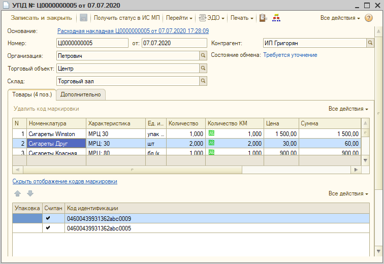 Для исходящих УПД с состоянием обмена «ЭД не сформирован» есть возможность удаления из документа считанного кода маркировки или ШК упаковки. По кнопке «Удалить код маркировки» панели инструментов ТЧ «Товары» открывается приглашение к вводу удаляемой марки. При сканировании происходит поиск считанной марки с последующим ее удалением. При считывании марки из упаковки она будет удалена, а для всех марок из этой упаковки будет снят признак «Упаковка», о чем будет выдано соответствующее предупреждение.