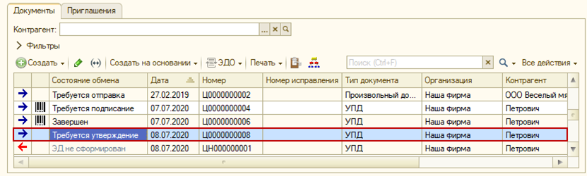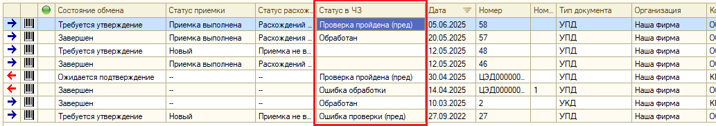 В форме списка документов статусы проверки отображаются в отдельной колонке. По неподписанным УПД, УПДи: Проверка пройдена (пред) или Ошибка проверки (пред). Если документ не подлежит проверке или ещё не прошёл её, статус не отображается. По всем подписанным УПД, УПДи, УКД: Обработан или Ошибка обработки.