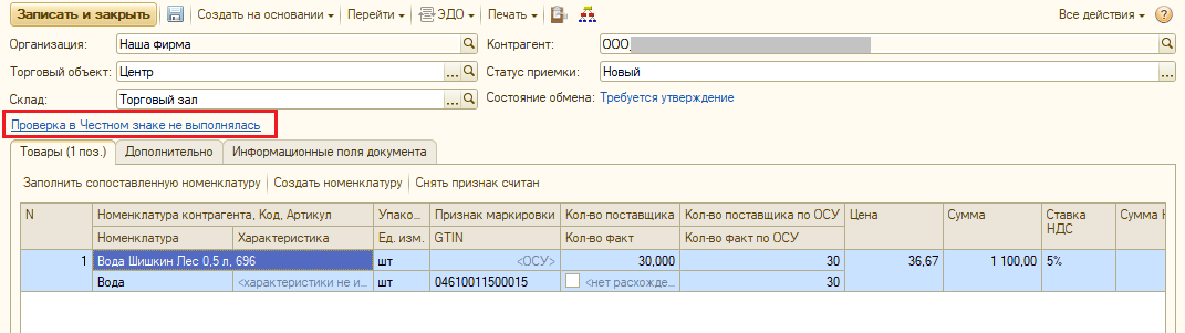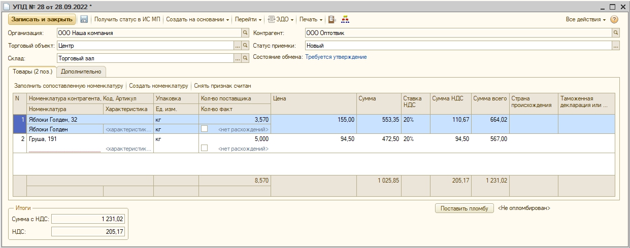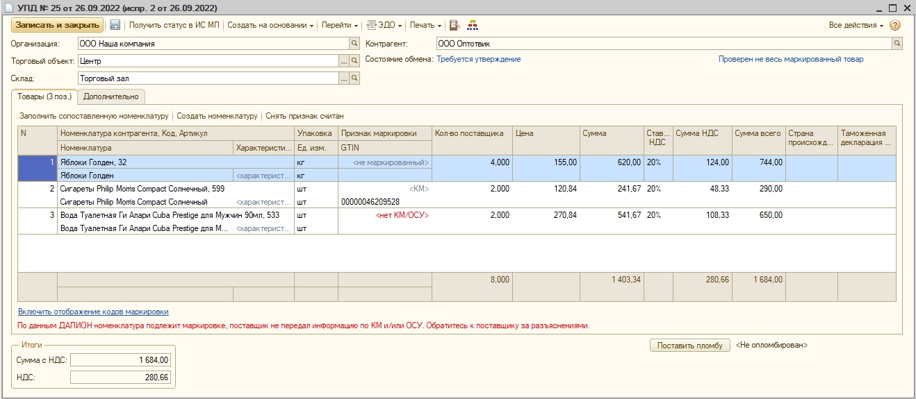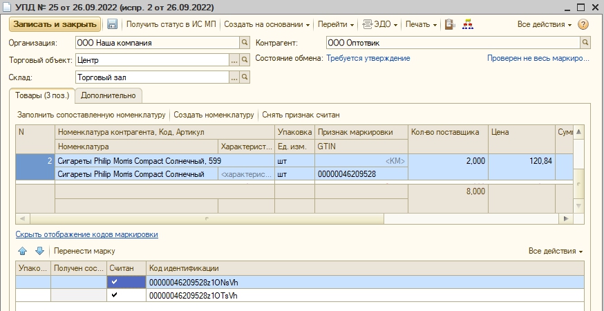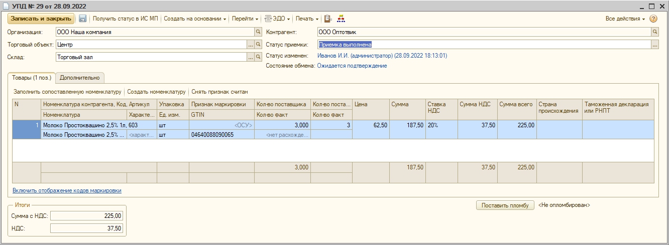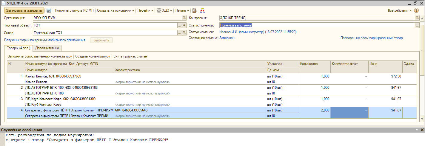 Пересчета фактического количества в УПД при сканировании не производится, при смене статуса на «Приемка выполнена» ставится вручную. При этом, если марки были считаны все или частично, то фактическое количество сравнивается с количеством и, в случае выявления расхождений, выдается предупреждение.