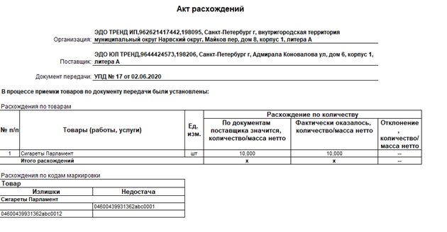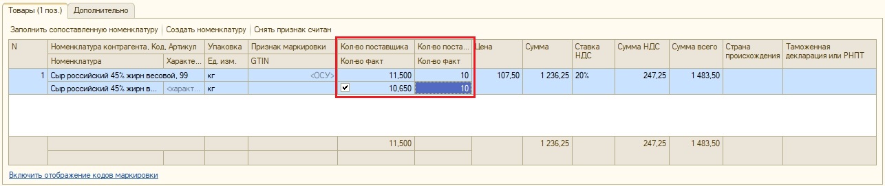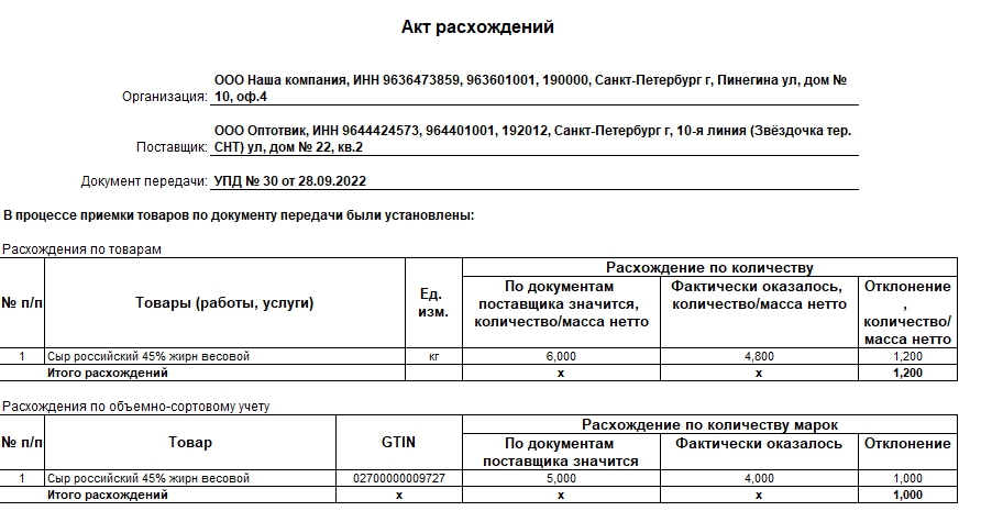 На приведенном ниже примере по данным поставщика отправлено 5 кодов (маркируется голова сыра) общим весом в 6 кг. По факту оказалось что пришло 4 головы общим весом 4,8 кг.