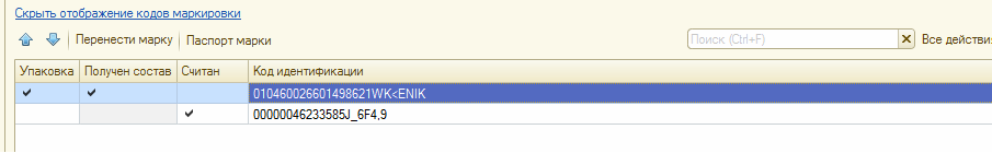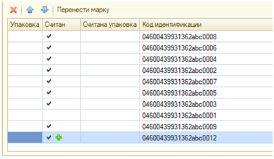- Если считанная марка есть в документе, то она добавляется в ТЧ с марками, для нее проставляется признак Считан.