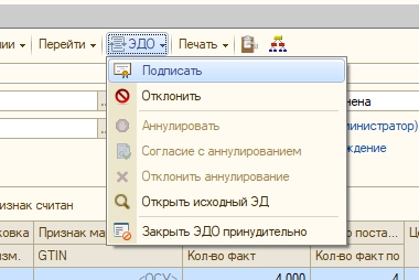 1. Если все данные в документе верны, то документ может быть подписан по команде «ЭДО – Подписать». Предварительно в документе нужно установить Статус приемки — «Приемка выполнена». На основании подписанного электронного документа вводом на основании формируется «Приходная накладная».