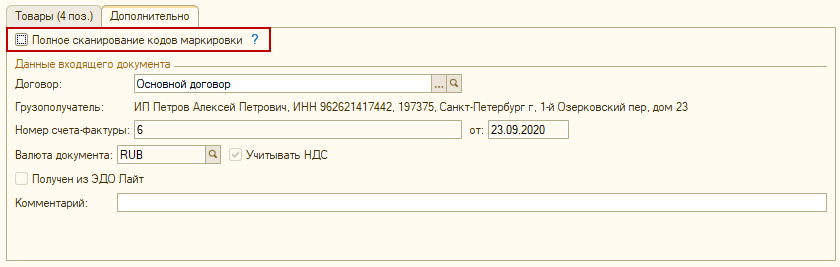Если НЕТ — на закладке «Дополнительно» проставляется флаг Полное сканирование кодов маркировки и в движениях будут участвовать только считанные марки.
