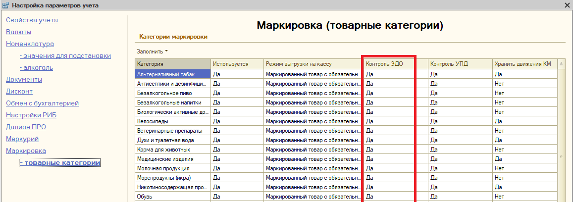 Также есть возможность запретить подписание документа, если он не прошел предварительную проверку в Честном знаке. Такой запрет включается отдельно на каждую категорию маркированной продукции в Настройках конфигурации в подразделе Товарные категории настройкой "Контроль ЭДО".