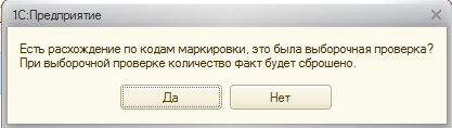 Если пользователь отвечает ДА, то движение в контуре факт будет по всем имеющимся в документе маркам, то есть они будут соответствовать движениям по контуру ИС МП. Аналогичное движение будет, если марки вообще не считывались.