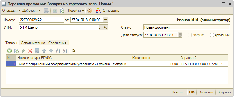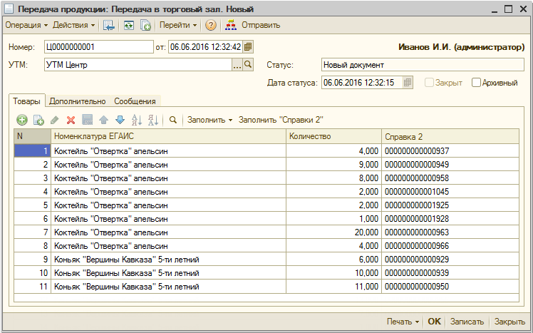 Документом «Передача продукции» оформляется перемещение алкоголя в/из торгового зала (регистр 2).