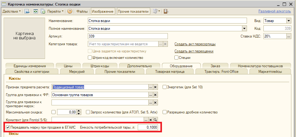 На закладке Оборудование нужно установить признак "Передавать марку при продаже в ЕГАИС". Обязательно нужно указать объём в литрах. Признак предмета расчета при этом автоматически устанавливается "Подакцизный товар".