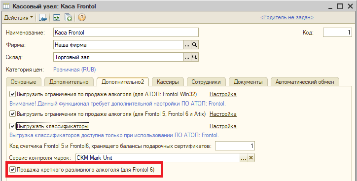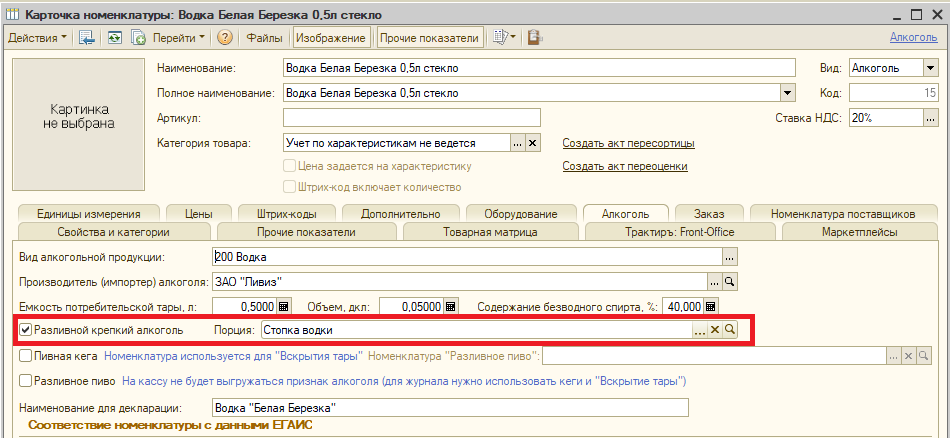 Если в Кассовом узле не будет включена настройка Продажи крепкого разливного алкоголя, карточка номенклатуры порции выгрузится как обычный товар, а карточка номенклатуры на розлив выгрузится как обычный алкоголь.