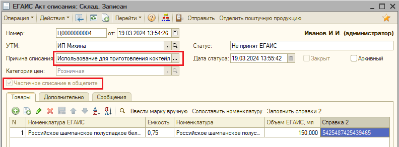 Он сформируется с причиной вывода Использование для приготовления коктейлей (блюд) и признаком Частичное списание в общепите.