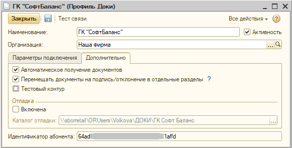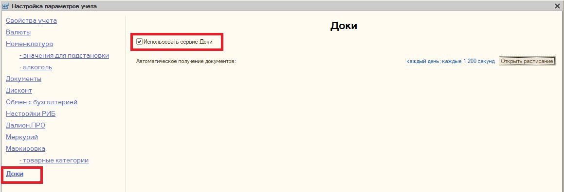 Оно включается в профиле Доки на закладке Дополнительно. При этом само расписание автоматического получения документов устанавливается в Настройках параметров на соответствующей закладке Доки;