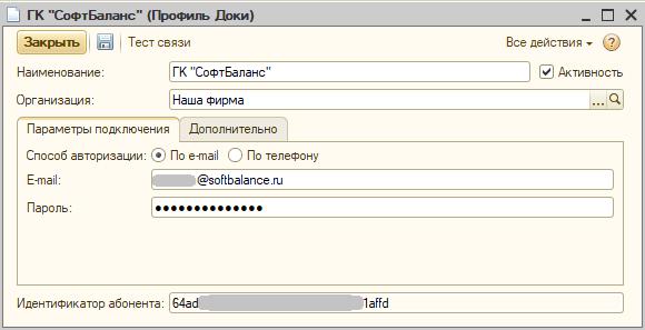 При создании профиля подключения на стороне ДАЛИОН есть два способа авторизации через электронную почту или по номеру телефона, в данном случае используется та же комбинация логин/пароль что и в случае подключения к самому сервису Доки.