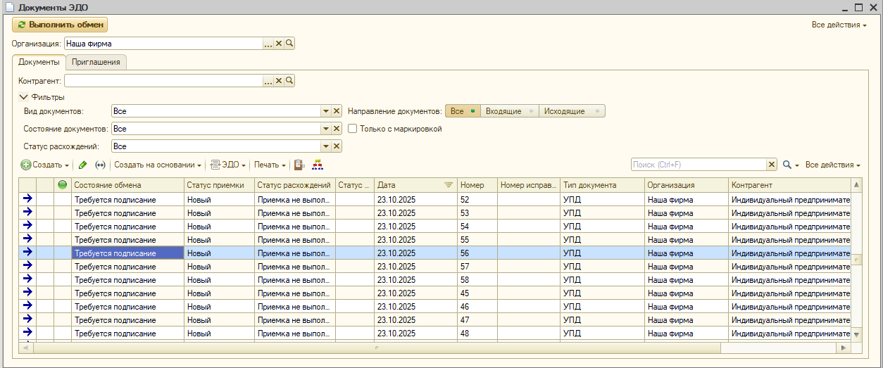 На данный момент реализована загрузка УПД, УКД и Произвольных документов, через команду "Выполнить обмен".