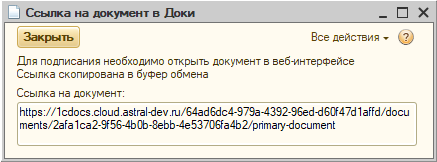 - если у вас нет доступа к сервису Доки — воспользуйтесь командой Подписать, при этом откроется ссылка на документ, которую можно скопировать и переслать сотруднику с правом подписи в сервисе Доки. Если у вас платформа 8.3.24 или выше, то ссылка автоматически будет скопирована в буфер обмена.