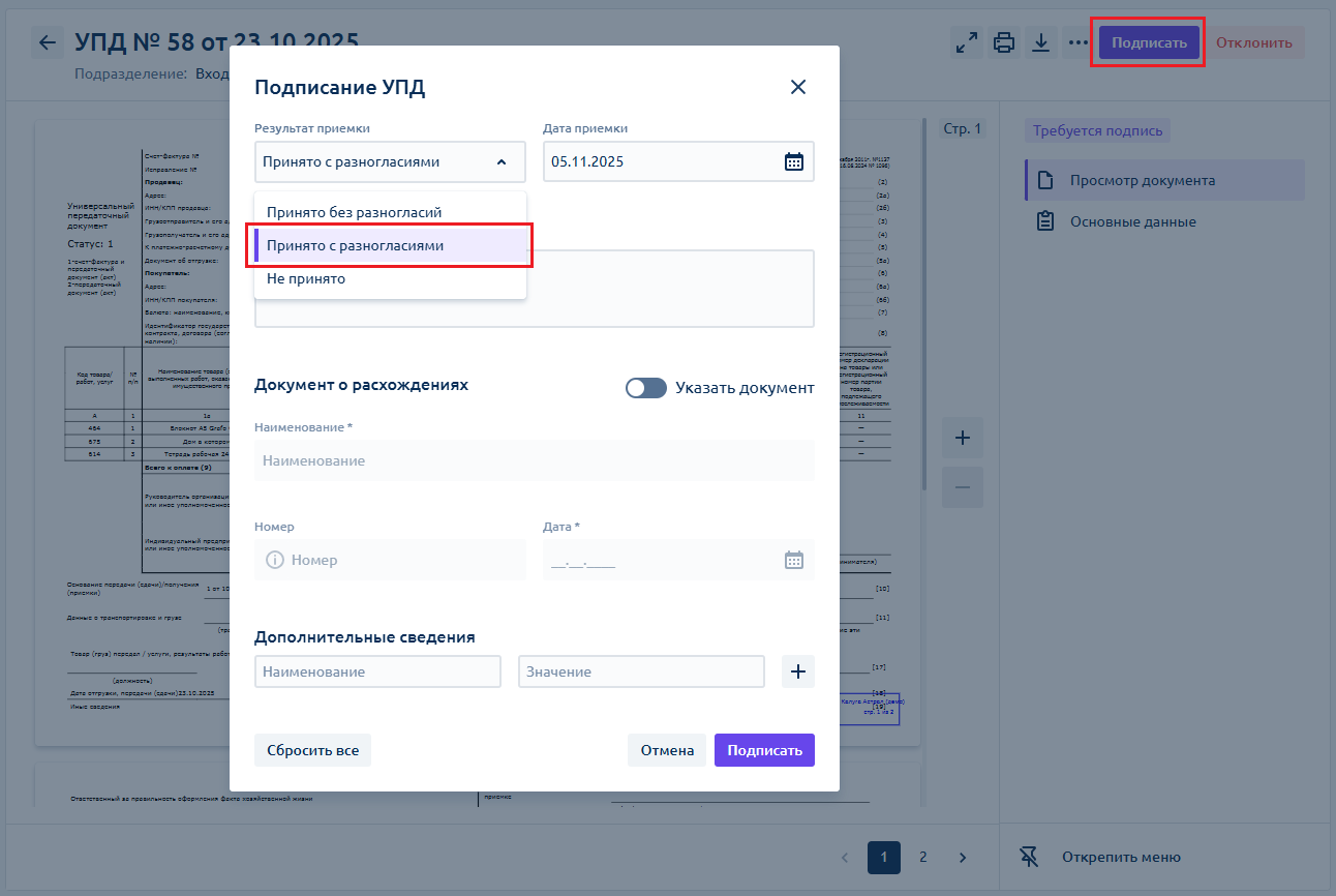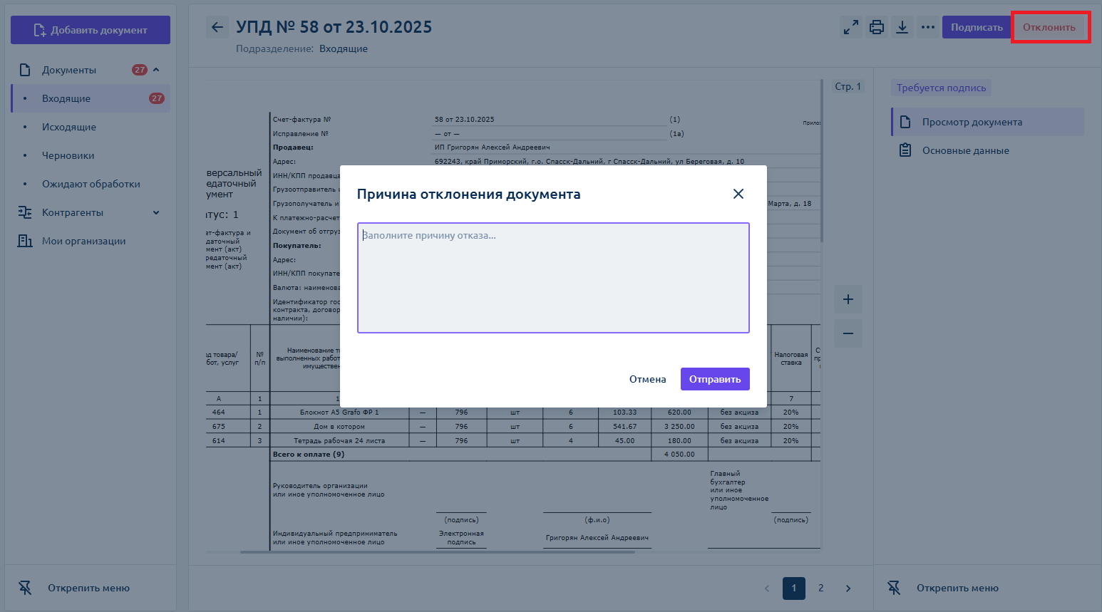 - если у вас есть доступ в личный кабинет профиля Доки и право подписи — воспользуйтесь командой Открыть в браузере, при этом документ автоматически открывается в браузере. Там вы сможете отклонить полученный документ, с указанием причины отклонения.