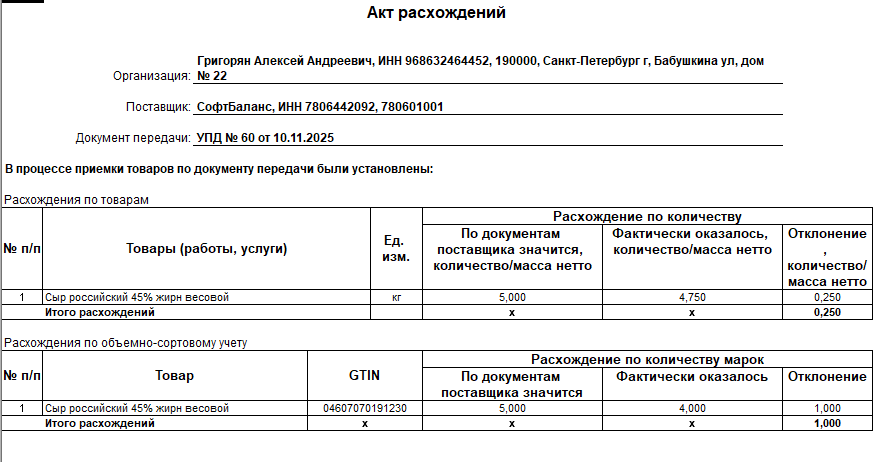 В случае если у вас объемно-сортовой учет маркированной (весовой) продукции, возможно расхождение как по весу, так и по количеству переданных марок, в этом случае в акте расхождений будут указаны оба параметра