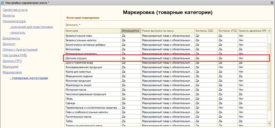 Для включения функционала маркировки, следует в Настройках параметров учета на закладке "Маркировка" установить соответствующую константу в товарных категориях.