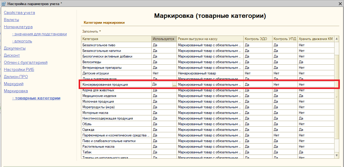 Для включения функционала маркировки, следует в Настройках параметров учета на закладке "Маркировка" установить соответствующую константу в товарных категориях.