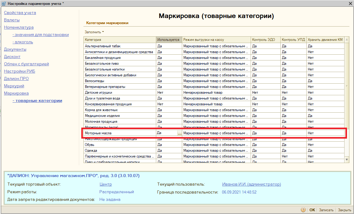 Для включения функционала маркировки, следует в Настройках параметров учета на закладке "Маркировка" установить соответствующую константу в товарных категориях.