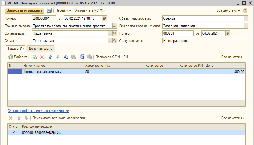 На закладку «Товары» сканированием добавляется маркированных товар, который требуется вывести из оборота, с указанием его количества и цены. Если сканирование по каким-то причинам невозможно - товары можно подобрать по коду кнопкой «Подбор по GTIN и SN».