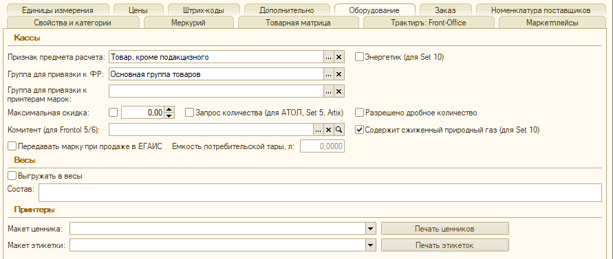 Часть основной информации о товаре в карточке номенклатуры расположена в общей части, остальная разнесена по нескольким тематическим закладкам.