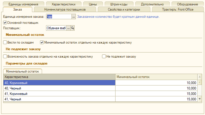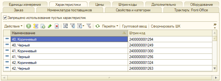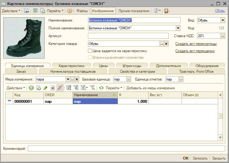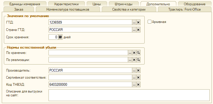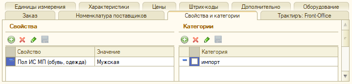 Категория товара — выбирается из справочника «Категории товаров» в случае, когда необходимо вести учет товара по характеристикам. Если категория у товара не выбрана, ведение учета по характеристикам невозможно.