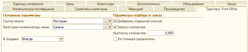 Справа вверху экранной формы находится название группы номенклатуры, в которой будет располагаться данный товар.
