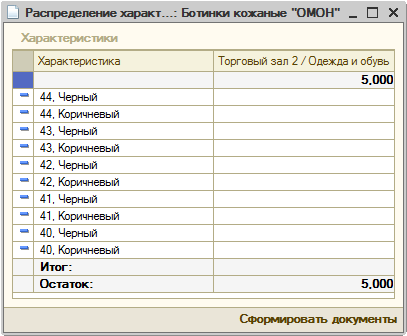Промежуточная форма перед созданием документа «Акт пересортицы», в которой отражены текущие остатки товара на складах, и которые в данном примере необходимо распределить между характеристиками. В первой строке отражено жирным шрифтом общее количество, которое подлежит распределению. В строке «Итого» — количество, которое уже распределено. В строке «Остаток» — количество, которое осталось распределить.
