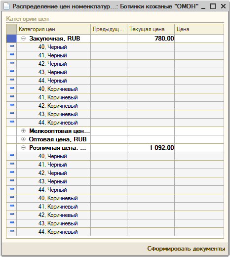 Промежуточная форма перед созданием документа «Акт переоценки», в которой отражены старые цены, и в которой в столбце «Цена» на все категории можно определить новые цены для нового режима работы. По кнопке «Сформировать документы» будут созданы заполненные документы «Акт переоценки».