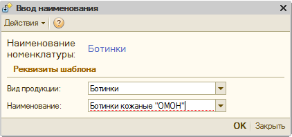 Если у группы номенклатуры, в которую заводится информация о новом товаре, выбран шаблон наименования, то прежде следует заполнить форму шаблона.