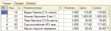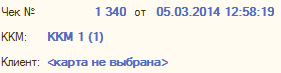 В верхней части закладки выводится информация о порядковом номере чека, времени его регистрации, номере ККМ, а если покупка сделана с использованием дисконтной карты, то фамилия клиента и номер его дисконтной карты.