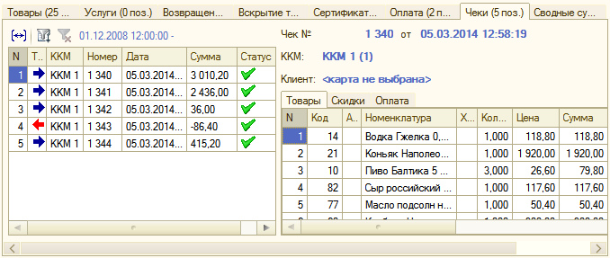 На закладке «Чеки» отображается информация о каждой позиции каждого чека.