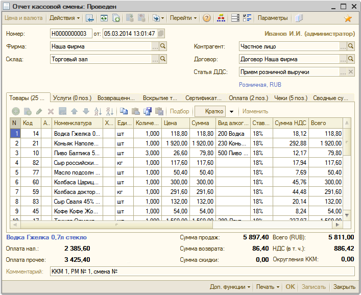 Документ «Отчет кассовой смены» (ОКС) предназначен для оформления продажи товаров населению в розницу с использованием ККМ, без указания конкретного покупателя (документ оформляется на клиента «Частное лицо» с видом контрагента «ККМ»). Предполагается, что продажа товара производится с розничного склада и расчет с клиентом производится в тот же момент времени. Документ формируется автоматически при торговле в розницу. При неавтоматизированном рабочем месте кассира документ может быть введен вручную.