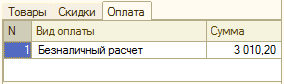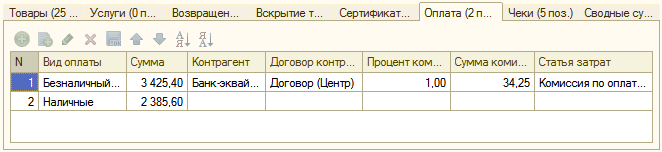 На закладке «Оплата» указывается вид оплаты, сумма оплаты по каждому виду, а также данные по эквайрингу (контрагент, договор контрагента, процент комиссии, сумма комиссии и статья затрат). Возможные виды оплаты содержатся в справочнике «Виды оплаты».