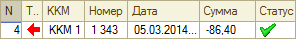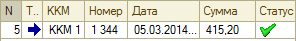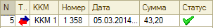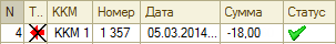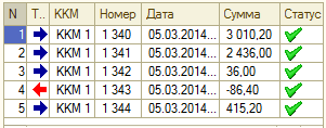 В столбце «Тип» условным значком обозначается выполняемое чеком действие. В крайнем правом столбце указан статус чека — пробит («галочка») или отменен («крестик»).