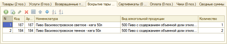 На закладке «Вскрытие тары» содержится информация о количестве вскрытых пивных кег.