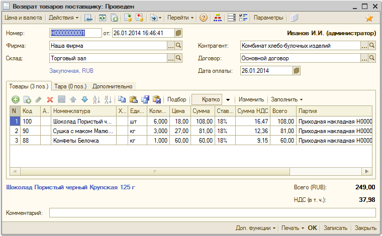 В табличную часть на закладках «Товары» и «Тара» заносятся сведения о возращенном товаре (и таре, если она есть), количество и цена.