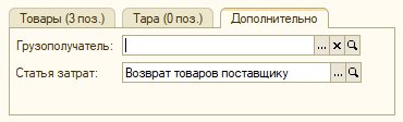 На закладке «Дополнительно» указывается статья затрат, на которую будут списаны затраты (если таковые будут), связанные с возвратом товаров, а также Грузополучатель.