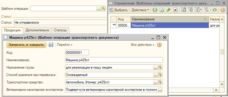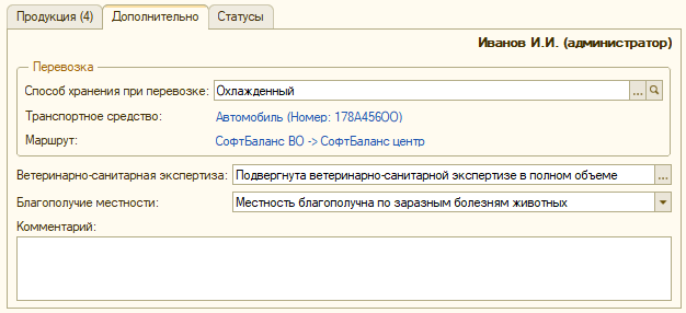 На закладке «Дополнительно» обязательно фиксируем данные о транспортировке продукции – способ хранения при перевозке, данные транспортного средства и маршрут. Указываем сведения о проведении ветеринарно-санитарной экспертизы и информацию о благополучии местности производства продукции.