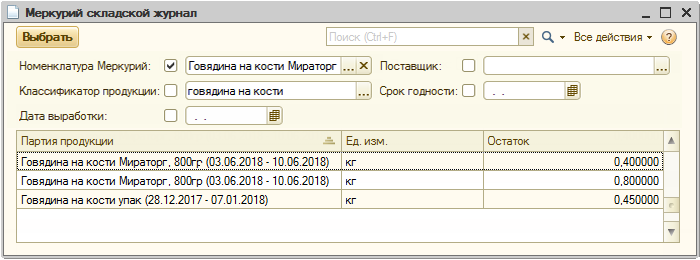 Партия продукции подбирается в документ через форму складского журнала, в которой выводятся текущие остатки организации, зафиксированные в системе «Меркурий». Для поиска нужной партии предусмотрен фильтр по номенклатуре Меркурий, 3 уровню классификатора продукции, поставщику, дате выработки и сроку годности.