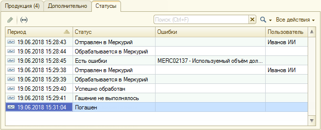 На закладке «Статусы» выводится информация о процессе фиксации данных в системе «Меркурий» и об ошибках, возникших при обработке этих данных.