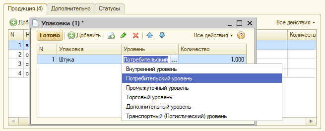 При добавлении упаковки необходимо указать уровень и количество. Подробнее об уровнях см. в справочнике «Упаковки».