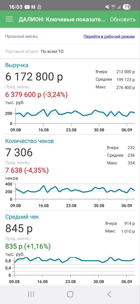 Для графиков Количество чеков и Средний чек необходимо чтобы на стороне ДАЛИОН вёлся учёт чеков (модуль Маркетинг), иначе эти графики будут пустыми.