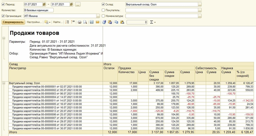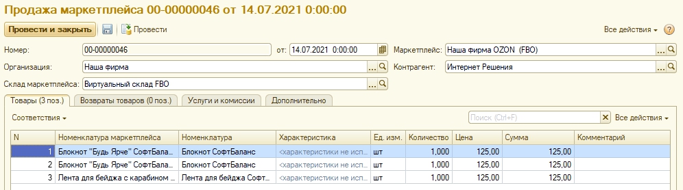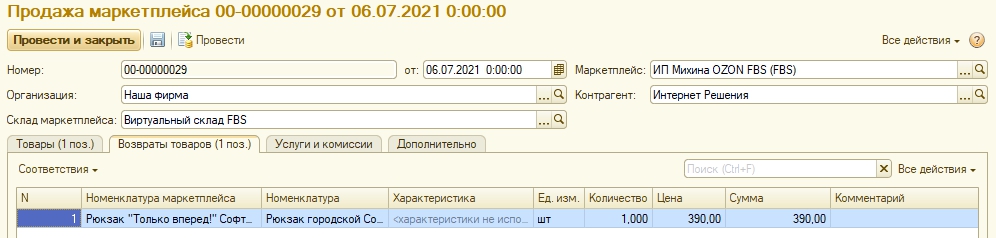 Данные о продажах независимо от схемы работы с OZON отражаются в документе «Продажи маркетплейса», в котором содержатся сведения о сумме продаж и возвратов, а также о комиссии и стоимости доставки OZON.