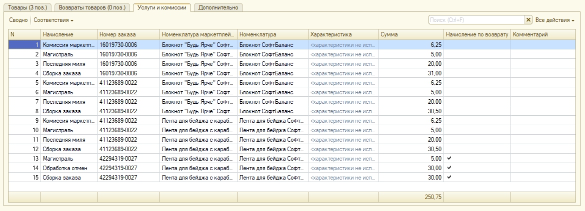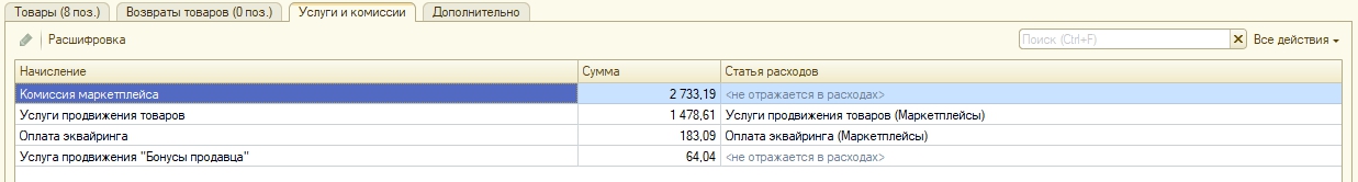 Группируются данные в этом случае по виду начислений с отображением общей суммы по ним. Загружаются как распределенные услуги и комиссии (относящиеся к конкретным заказам) так и общие услуги, которые будут отражаться на статье расходов: